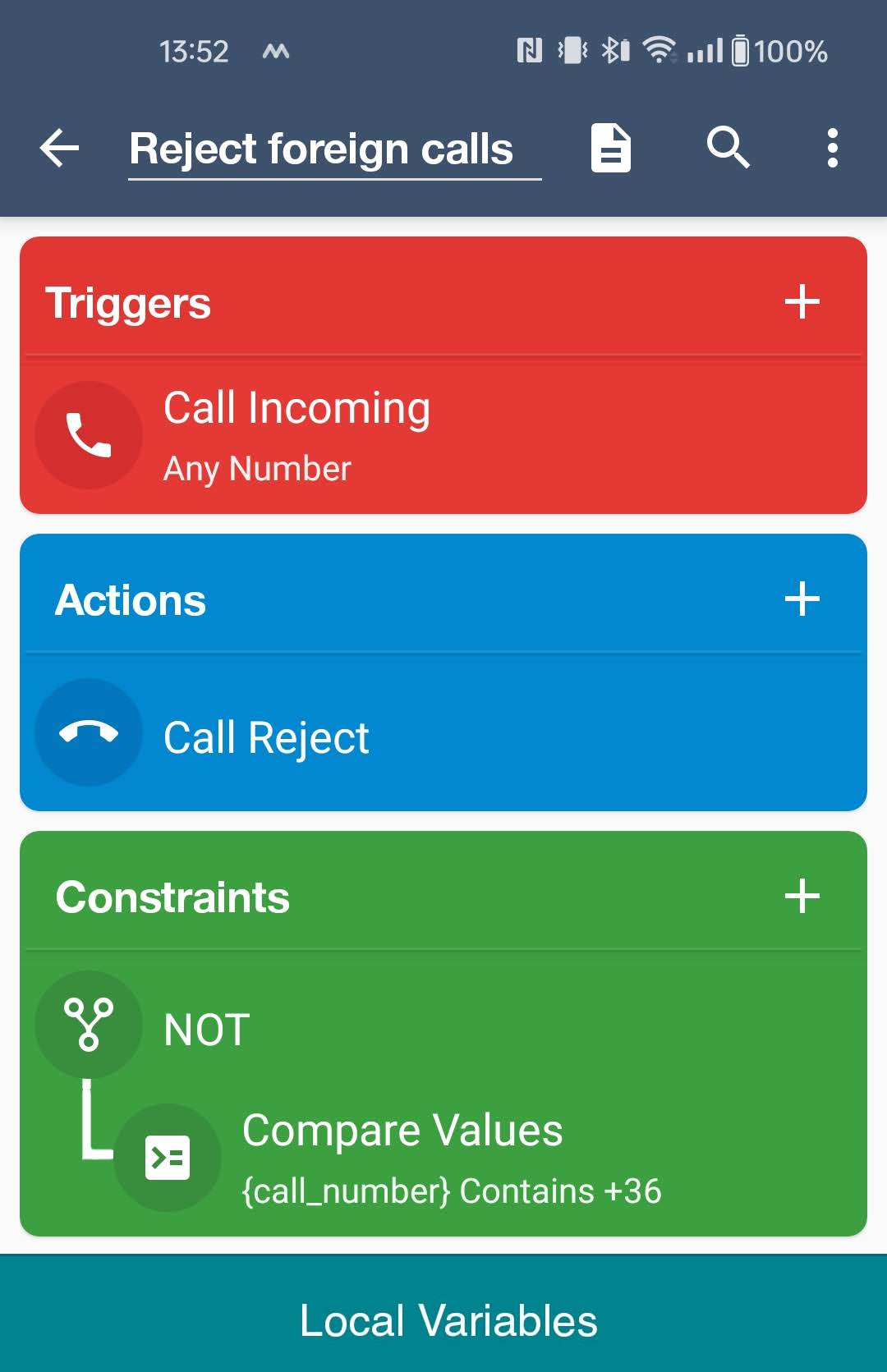 Thank you so much! I was looking for a similar solution but was unable to find a dedicated settings in Android. This is such an easy fix. I added a custom notification that alerts me when a number is blocked, in case of an account activation that might require a foreign call to be accepted. That way I avoid forgetting about the macro and losing my mind. Cheers!