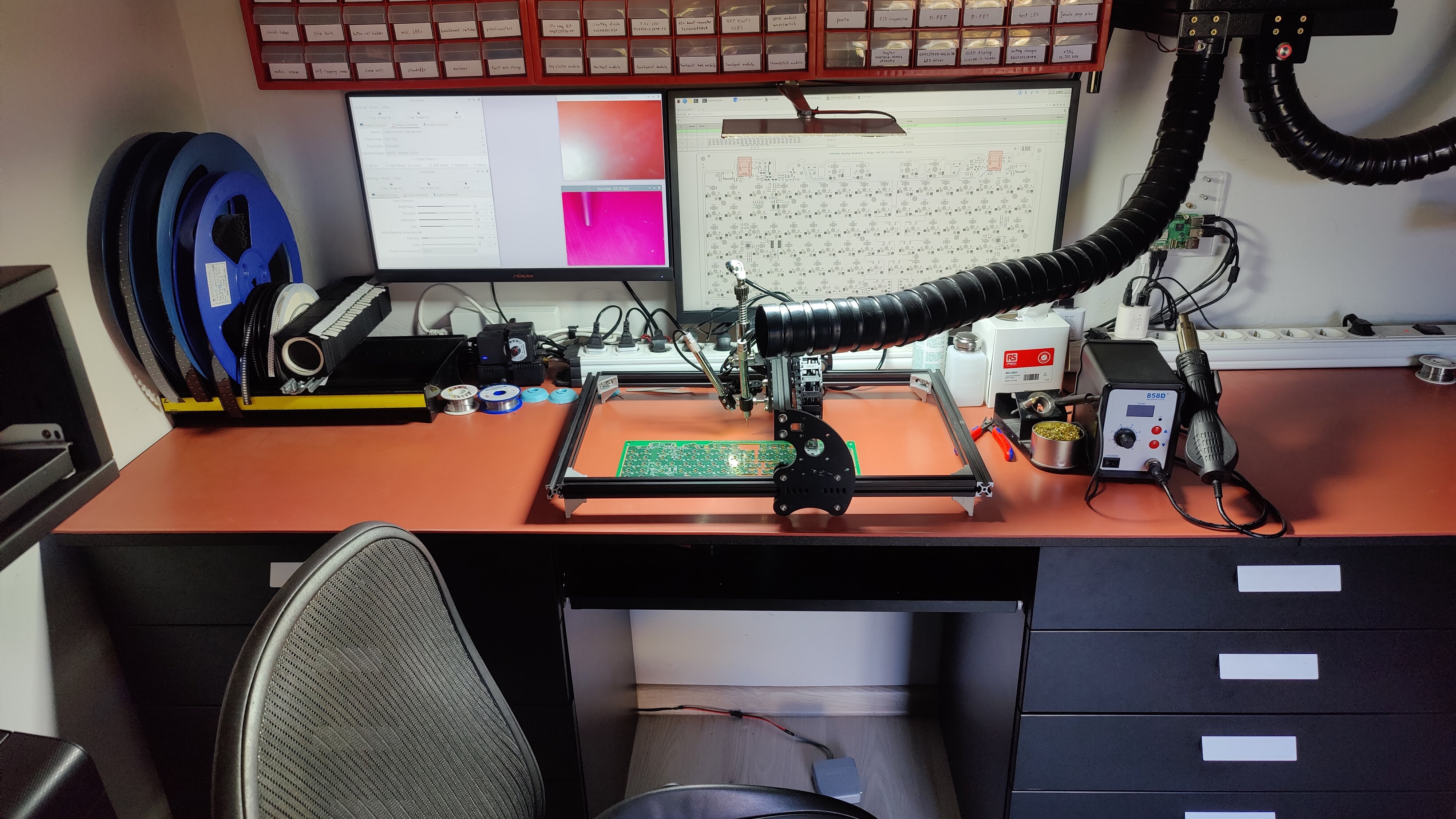 My current setup uses two monitors: a 4K display for the Interactive HTML BOM KiCad plugin on the right, and an HD monitor on the left showing the video streams from both microscopes, which is essential for placing fine-pitch components accurately.